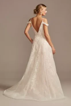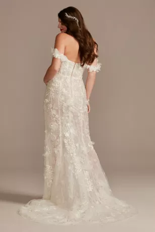 Whether it’s worn with just one shoulder, both straps or strapless, this sequin-strewn sheath wedding dress is perfect for the bride looking for versatility. Over 4,000 beads and six different shapes of floral appliques cover the dress, from the plunging neckline to the chapel train. A powermesh bodysuit sits beneath the romantic, semi-sheer lace layers for a sexy look that provides comfortable smoothing all day and night.