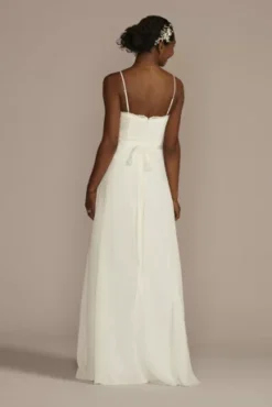 The elegant crepe bodice on this wedding dress is detailed with tank straps, a plunging V-neckline, and an open V-back, while the chiffon A-line skirt is topped with dozens of 3D floral appliques.