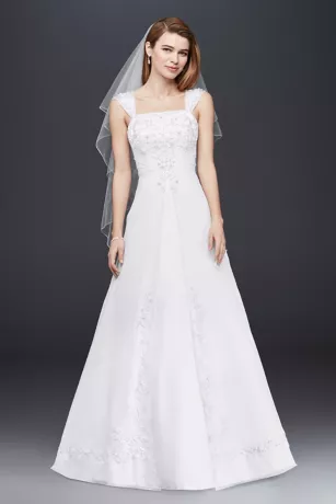 Designed with elegance in mind, this satin A-line wedding dress offers a versatile church-to-reception look, with its beaded cap sleeves. The satin skirt is topped with a metallic-embroidered chiffon overlay.