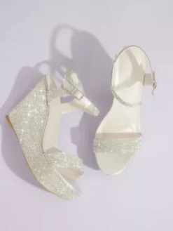 Steal the spotlight in these undeniably sparkly platform wedges, featuring allover crystal embellishments that hit every angle.