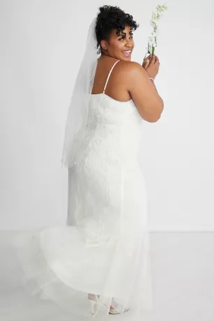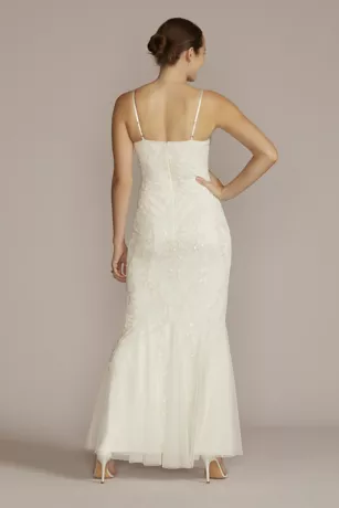 Hours of hand beading create the dreamy bodice on this sheath dress. Move with freedom in cascading godets along the full-length skirt.
