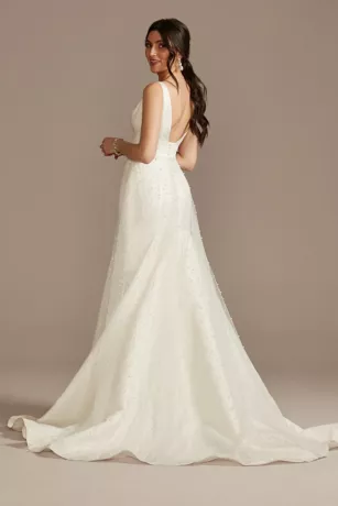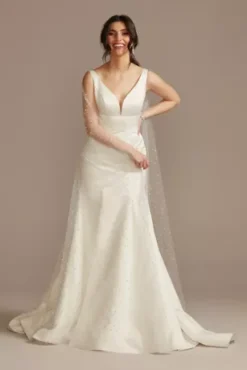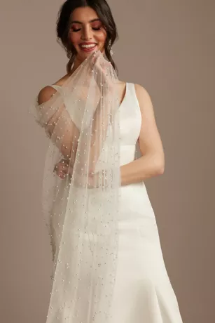 Dotted with pretty pearls, this tulle showpiece can be worn as a cape or a train.