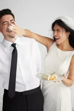 Prepare to wow as you walk down the aisle in this high-neck tank wedding dress. Adorned in allover tonal sequins, you’ll sparkle with each and every step. A low scoop back adds a final flourish, ensuring that your exit will be just as dramatic as your entrance.