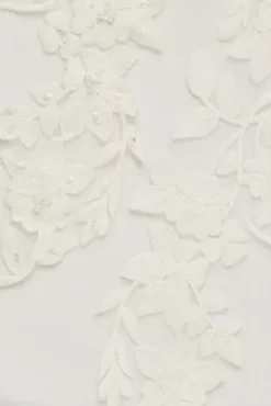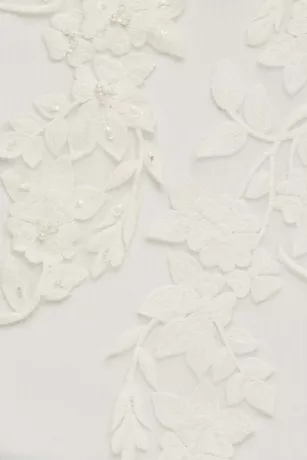 Beaded lace applique adorns the bodice of this lovely wedding dress, gracing the cap sleeves, V-neckline, and low V-back before trailing down the waist and stopping at the top of the tulle ball gown skirt. Complete with side pockets.