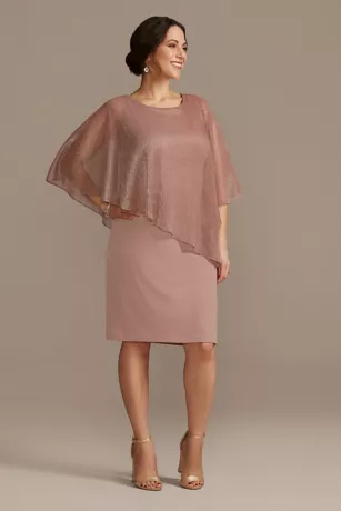 A modern silhouette that’s flattering too, this effortless jersey sheath dress is topped with an attached metallic asymmetrical capelet.