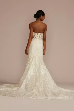 The picture of sultry romance, this alluring wedding dress uses its fabric, embroidery, and embellishment to create a vision of sexy sophistication. Opulent brocade appliques sit atop delicate, diamond patterned tulle, which covers the dress from the strapless illusion-plunge neckline to the trumpet skirt. An overlay of sequined, embroidered fabric and layers of tulle, glitter, and shimmering metallic filigree lace cascades into a dramatic cathedral train. Visible boning at the sheer bodice gives a corset-like appearance that ties together the old-meets-new romantic look.