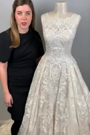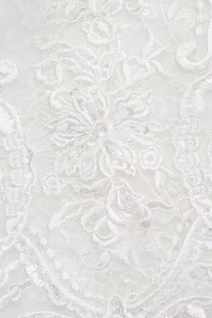 Yards of opulently beaded and appliqued tulle create softly folded pleats in the grand skirt of this stunning wedding dress. Covered in 5,000 beads and sequins, and finished with scalloped lace trim around the hemline, this Oleg Cassini ball gown is truly breathtaking to behold.