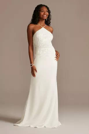 Simple yet undeniably elegant, this comfortable stretch crepe sheath dress is detailed with a spaghetti strap halter neckline and a figure-flattering beaded waistband.