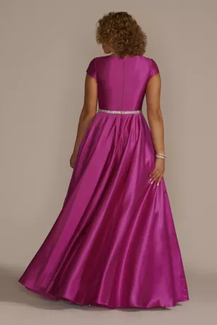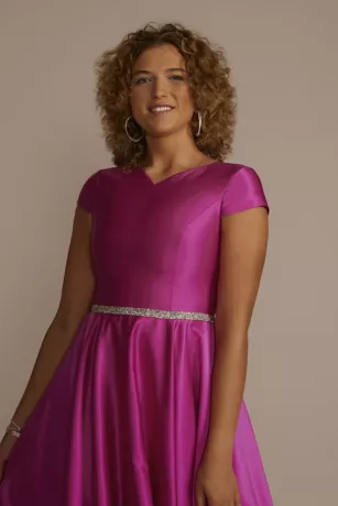 A sparkling embellished waist elevates the sleek satin of this beautiful ball gown. The high neckline and cap sleeves make for a modest yet modern prom or special occasion look.