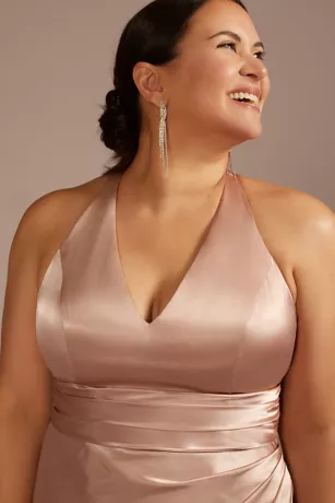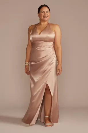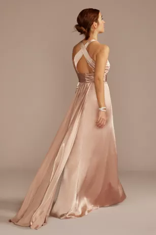 This bridesmaid dress stands out from the crowd with satiny charmeuse fabric, flattering draping, and a crisscross back complete with a streamer.