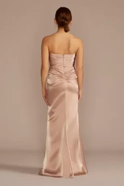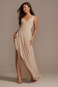 So glam! This silky, satin-like charmeuse bridesmaid dress goes all out with a cowl neckline, swag sleeves, adjustable spaghetti straps, and a faux wrap skirt with slit. Features bra cups.