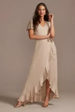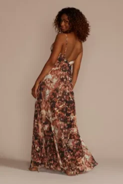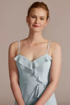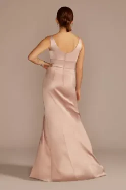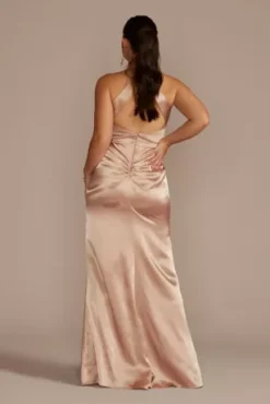 This long charmeuse bridesmaid dress elevates the simple slip dress with a cowl neck and crisscross back. Features adjustable straps and bra cups.