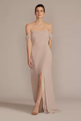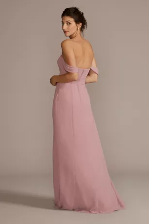 Off-the-shoulder swag sleeves and a cowl neckline turn this chiffon bridesmaid dress into a showstopper. Features side pockets.