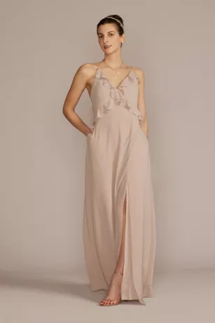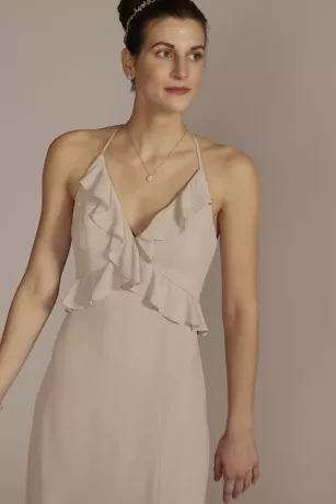 The sweetness of ruffles combines with a statement back on this modern chiffon bridesmaid dress. Did we mention it has pockets?