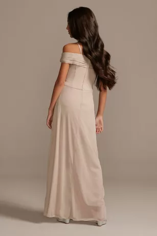This mesh junior bridesmaid dress features off the shoulder sleeves that create a ruched crisscross bodice. Spaghetti straps complete the look.Â