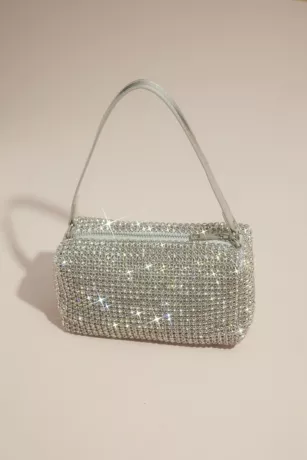 This slouchy purse features a metallic top handle and allover shiny rhinestone crystal embellishments.