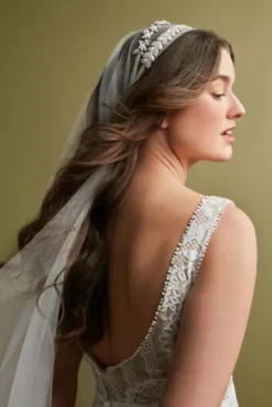 Featuring a garland of alternating crystal leaves and pearl teardrops, this headband will add sophisticated sparkle to your wedding day look.