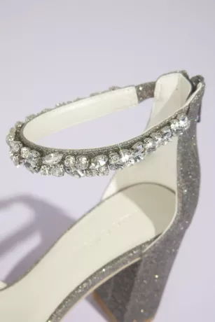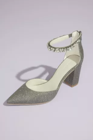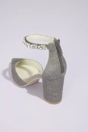 Get glowing in these glittery pointed toe pumps, topped with a zipper back and a crystal-encrusted ankle strap.