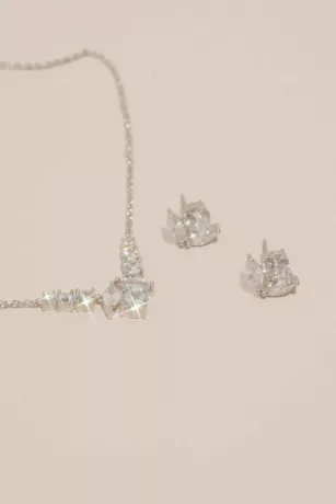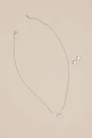 Detailed with shimmering cubic zirconia crystals, this matching jewelry set features a necklace and stud earrings, each showcasing round and marquis cut gems that form blooming rosebuds.