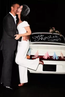 This chic crepe jumpsuit is defined by crisp lines, from the dramatic off-the-shoulder cuffed neckline to the clean seams down the bodice to the wide leg, pocketed pants. Rock a sleek ponytail and a statement earring to complete the look.