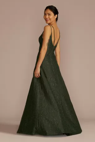 Delicate details shape this A-line gown, like double spaghetti straps, a v-neckline, and airy lace fabric, adding a formal element to the versatile silhouette. Perfect for your next wedding or special event.