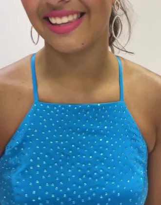 Sparkle and shine at prom or your next special occasion in this sleek satin ball gown embellished with countless heat set crystals. A beautiful mix of modest and modern details is evident through the high neckline, full skirt, dramatic slit, and lace-up open back.