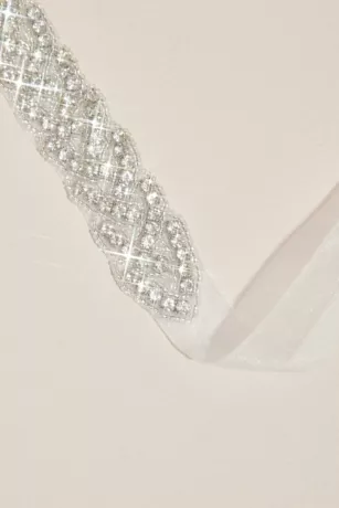 Organza ribbon with a slight sheen beautifully frames the twinkling crystal embellishments of this sparkly sash. We love it for giving wedding dresses and party outfits the perfect finishing touch.