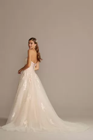 Beaded floral lace appliques bloom in the faintest shade of pink on this romantic ball gown wedding dress, while golden embroidered branches and a voluminous tulle skirt add to the fairytale feel. Finished with a lace-up corset back for a perfect fit.