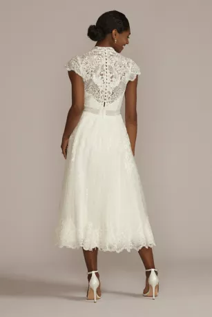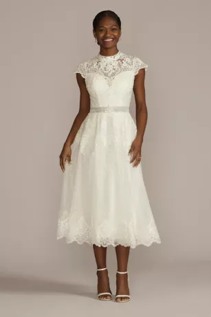 Ornate lace and floral applique is layered atop illusion mesh and tulle to form this modern heirloom wedding dress. The vintage-inspired appliques create a high mock neckline, while eyelash-trimmed scallops adorn the cap sleeves and tea-length skirt.