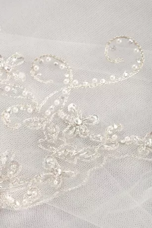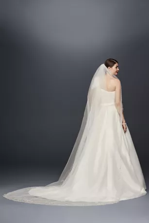 Metallic embroidered and crystal encrusted filigree motifs edge this cathedral length veil for a dramatic addition to your big day.