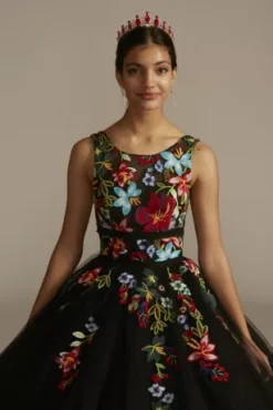 This quinceanera dress bursts with elegance! Turn heads with the perfect blend of traditional and contemporary, from the multicolor floral appliques to the illusion neckline to the full tulle skirt.