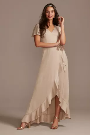 Crafted of crepe-back satin, this bridesmaid dress has a luminous shine from the flutter sleeves to the V-neckline to the ruffled skirt hem. A tie at the waist adds the finishing touch.Â