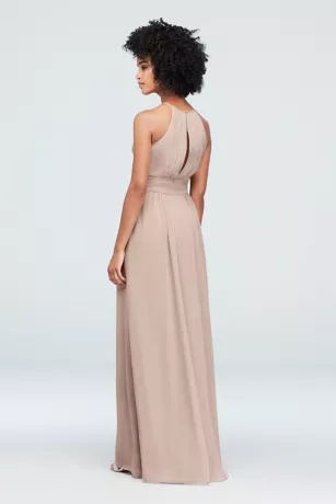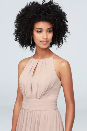 Graceful pleating and a keyhole neckline add extra elegance to this long chiffon bridesmaid dress. The ruched waistline provides figure-defining detail.