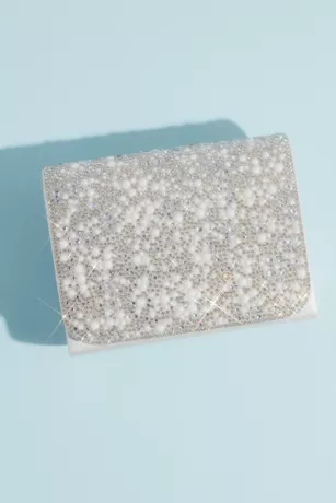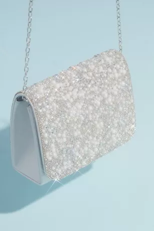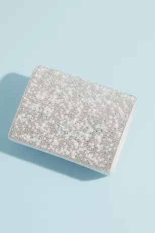 Brilliantly sparkling crystals and iridescent stones cover the front fold of this metallic crossbody bag.