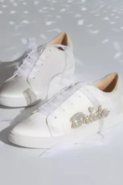 Impress them with your fancy footwork in these jeweled “Bride” sneakers, perfect for casually burning up the dance floor at your reception. Finished with a silver heel detail and organza laces.