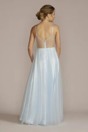 Cinderella who? Be the star of your night in this A-line stunner featuring glistening lace applique atop a slit-accented mesh skirt. Don’t forget your best heels before you go!
