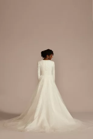 Get ready for a romantic walk down the aisle in this dreamy beaded A-line wedding dress featuring two types of lace appliques on the modest high neck bodice and lined long sleeves. The full tulle skirt flows into a breathtaking chapel train for ultimate drama.