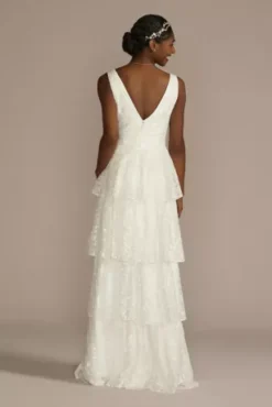 Alluring and elevated, this lace and crepe sheath wedding dress features a sheer bodice with ornate lace details and a sweeping train. The back of the gown is accented with a lingerie-inspired lace strap.