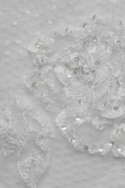 Crafted with eleven different types of lace and 4,500 hand-beaded embellishments, this wedding dress is fit for royalty. Sequin appliques, pearl-beaded cross-back spaghetti straps, and a multi-layer tulle skirt lends subtle sparkling detail to the look. Complete with a chapel train.