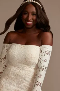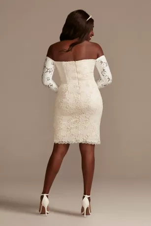 Wow the crowd at your wedding event with this short stretch lace dress featuring an off-the-shoulder neckline, long sleeves, and a scalloped hem.