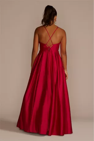 This satin ball gown features a dramatic pleated skirt that beautifully contrasts the fitted bodice with a sexy cutout to play up your waist. In this ensemble, the prom queen title is yours for the taking!