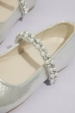 A favorite for first communions and flower girls, these metallic ballet flats stay secure through every twirl with a pearl-embellished Mary Jane strap.