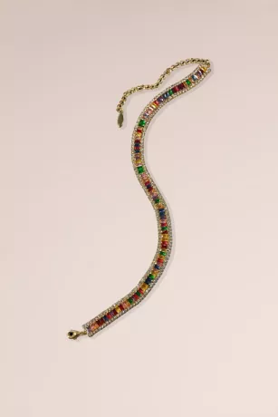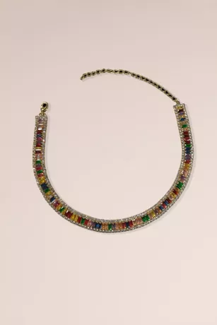 This dazzling choker necklace features multicolor baguette crystals bordered by smaller crystals that sparkle from all angles.