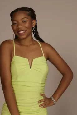 Effortlessly chic, this sheath was designed with details to flaunt at prom or your next big night! A notch adds interest to the V-neckline, while ruching and jersey fabric work together to highlight your curves.