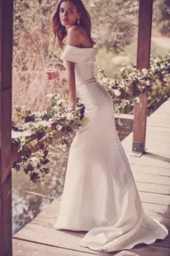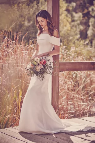 A crisp and classic look for the traditional bride with a fashion-forward streak, this mikado trumpet gown features an off-the-shoulder cuff neckline and back button detail that goes from the neckline to the end of the train.