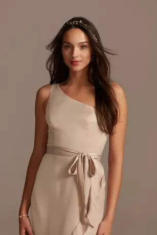 Crafted of crepe-back satin, this bridesmaid dress has a luminous shine from the one-shoulder neckline to the ruffled skirt hem. A tie at the waist adds the finishing touch.