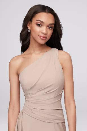 A breathtaking side cascade flows from the asymmetrical draped waistline of this one-shoulder georgette bridesmaid dress. The universally flattering silhouette looks gorgeous on every body type.
