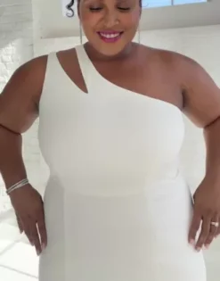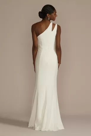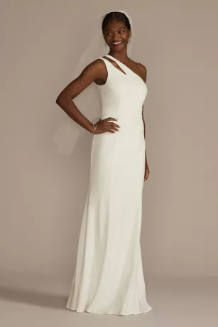 Crafted of stretch crepe for a comfortable fit, this sexy sheath wedding dress features an asymmetrical cutout neckline and a flirty figure-hugging skirt.