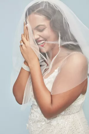 Classic, elegant and stunning, this raw-edge, one-tier blusher veil is the perfect addition to your wedding look.