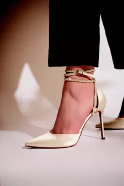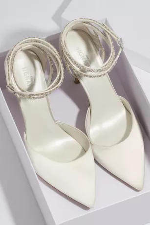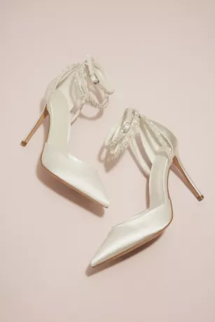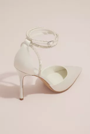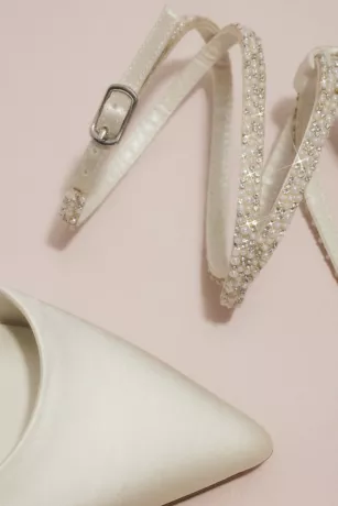 Classic with a cool twist, these pointed satin pumps are finished with ankle-wrapping skinny straps, encrusted with pearls and crystals.